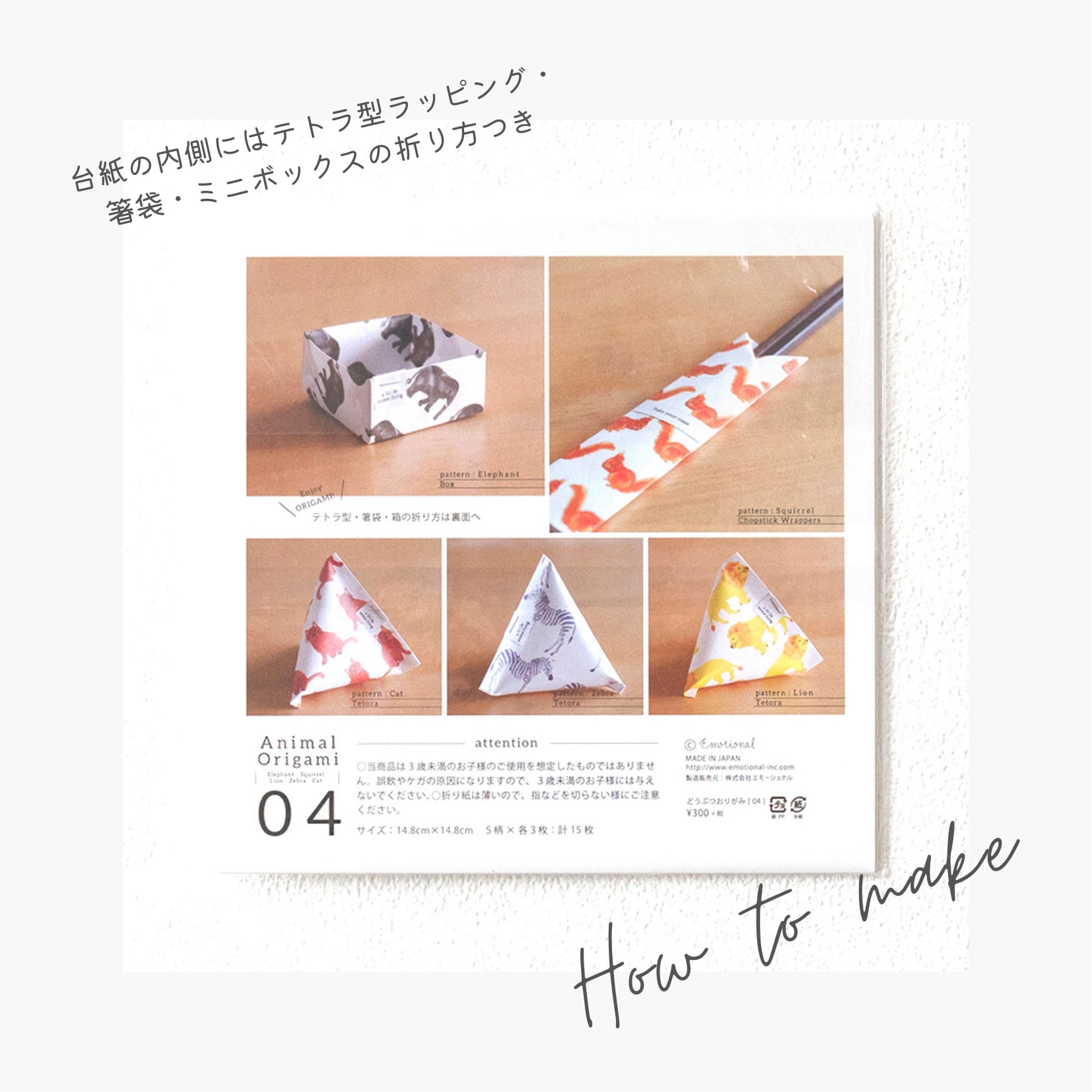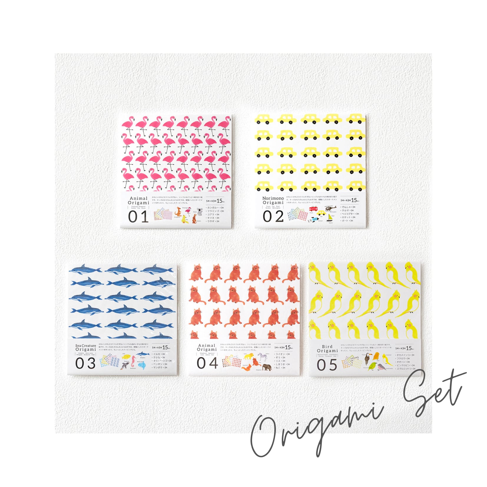 かわいい動物柄やのりもの柄の折り紙セットです。動物たちのほっこりかわいらしい表情が、ほんわかとハッピーな気分にさせてくれます。折り紙としてもちょっとしたラッピングにも、アレンジ自由です。